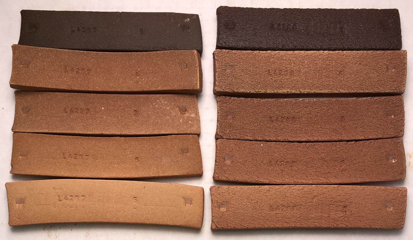Or: Note the read bar, which has the 30-80 mesh aggregate is warping less. That means that an addition of silica sand (and bentonite since it needs plasticity) to the 80 mesh material might help.