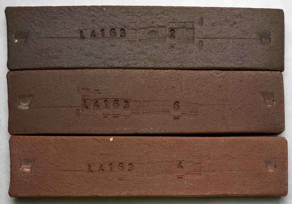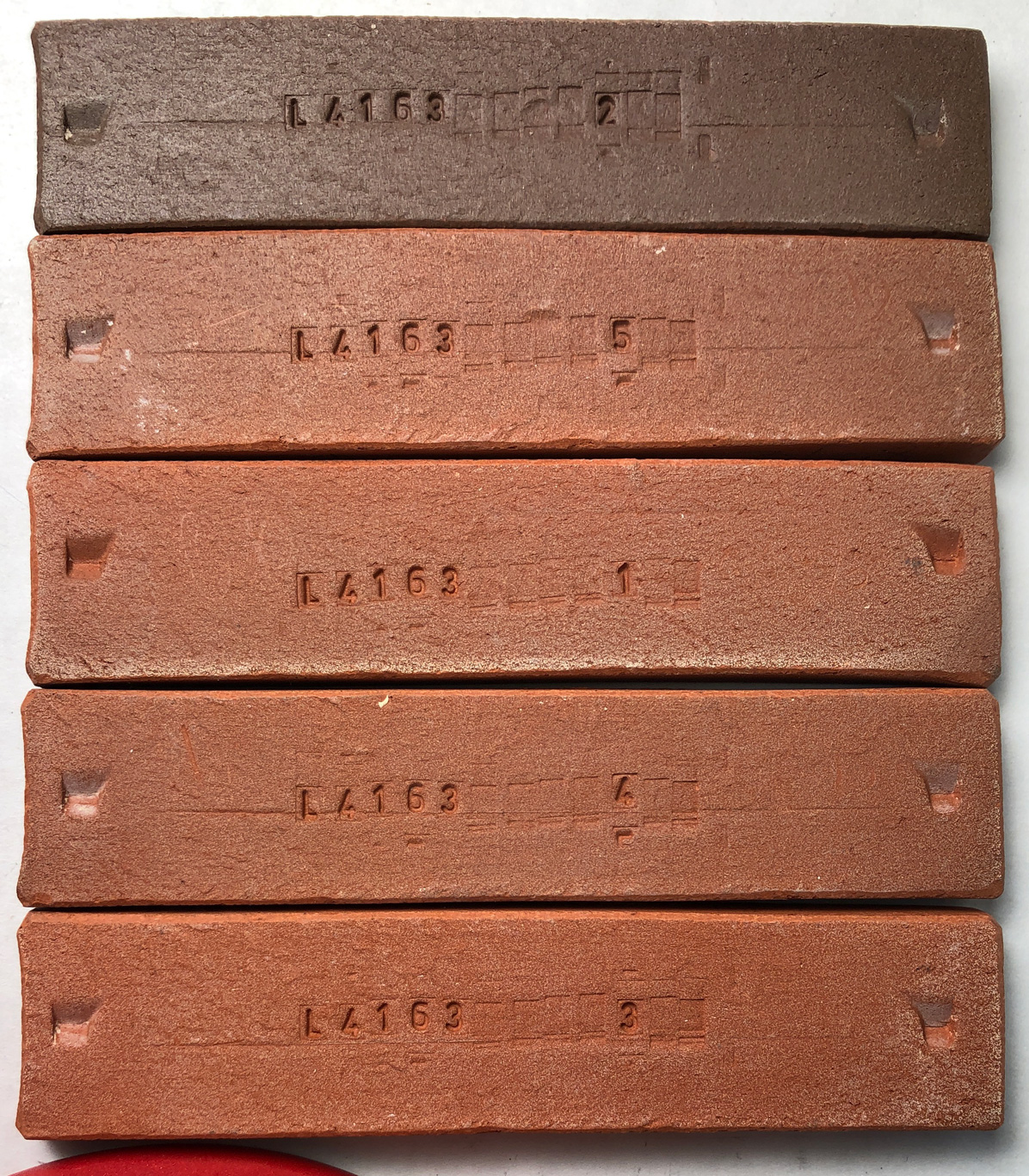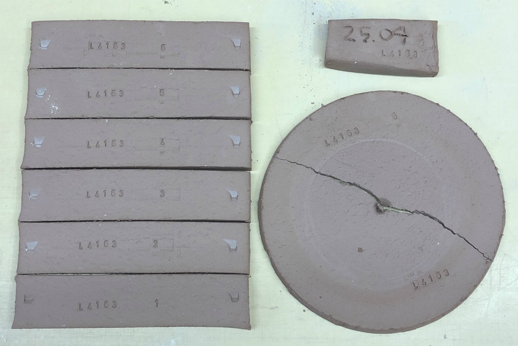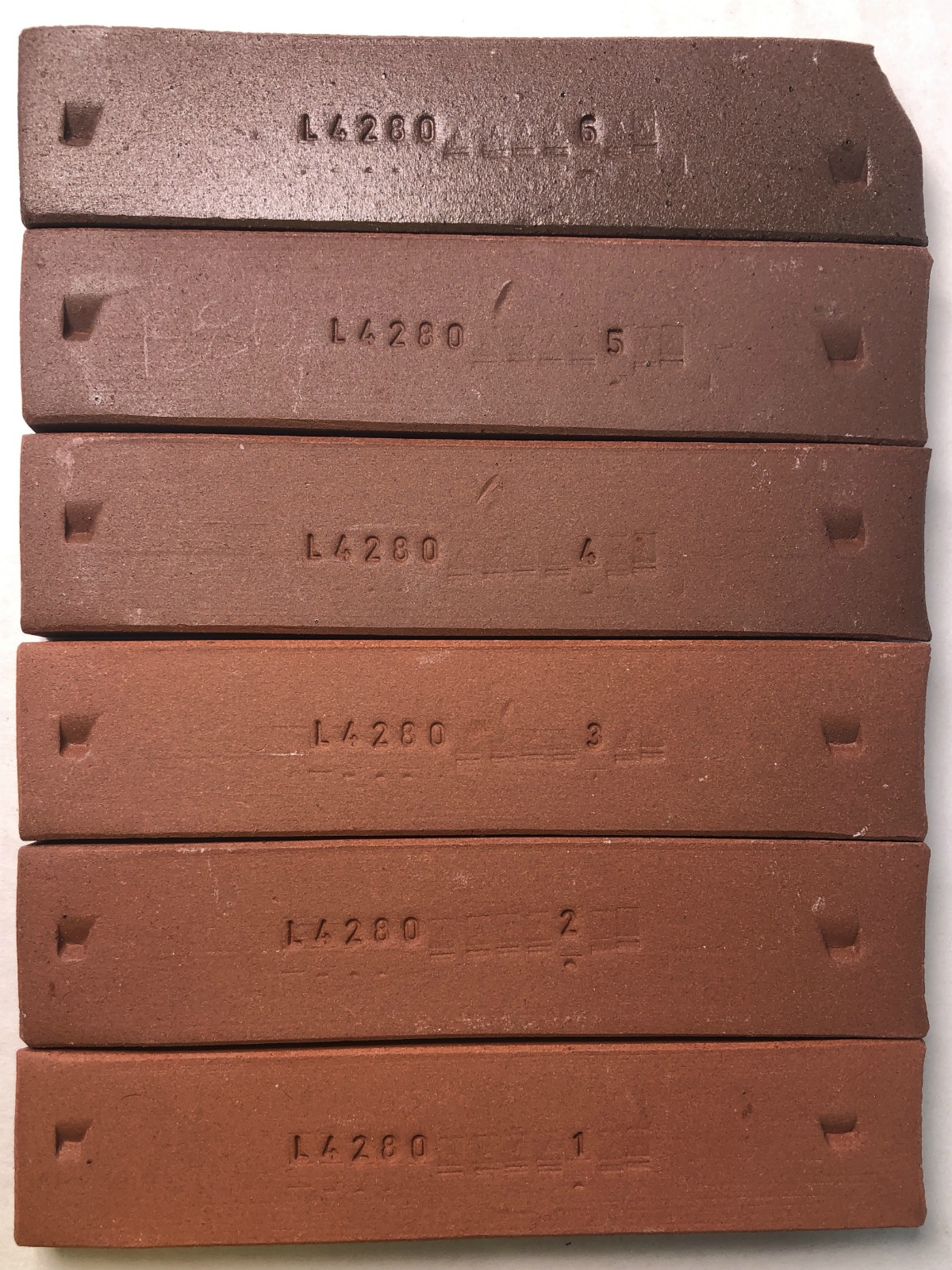 Fired from cone 5 (top) down to cone 02 (bottom). Testdata SHAB - Shrinkage/Absorption