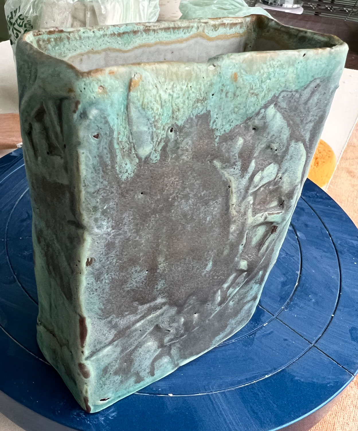 The variegation is a product of melt fluidity, metal oxide saturation, thickness variation, the presence of titanium, tin or rutile, crystallization, phase differences, bubbling due to gas generation of decomposing carbonates, dark clay body below.