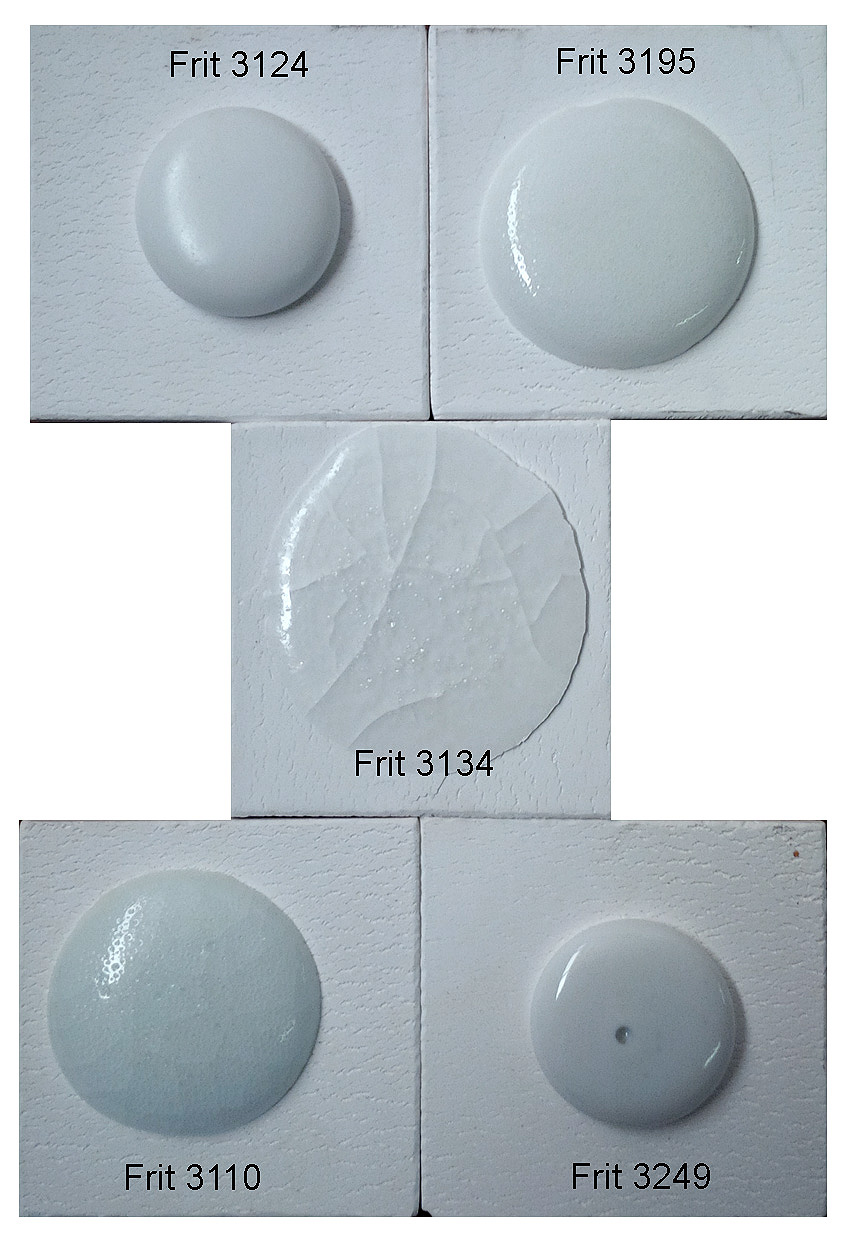 Five common North American Ferro insight-live.com/glossary/43">Frits fired at 1850F on alumina tiles (each started as a 10-gram GBMF test ball and flattened during the firing). At this temperature, the differences are more evident than at 1950F. The degree of melting corresponds mainly, but not only, to the percentage of B2O3 present. Frit 3134 is the runaway leader because it couples that with almost no Al2O3 to stabilize the melt. Notice also the crack pattern, it is also very high in Na2O and thus has a high COE. However, why does Frit 3110 melt so well even though it contains almost no B2O3? Even higher Na2O, it is a powerful flux. Its COE is even higher than Frit 3134, but it is thick enough to have resisted cracking far (but it will in time).